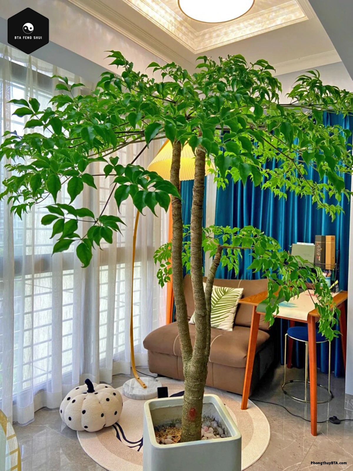 - Phòng khách: Đặt cây lớn ở góc phòng hoặc cây mini trên bàn để tăng vượng khí.
