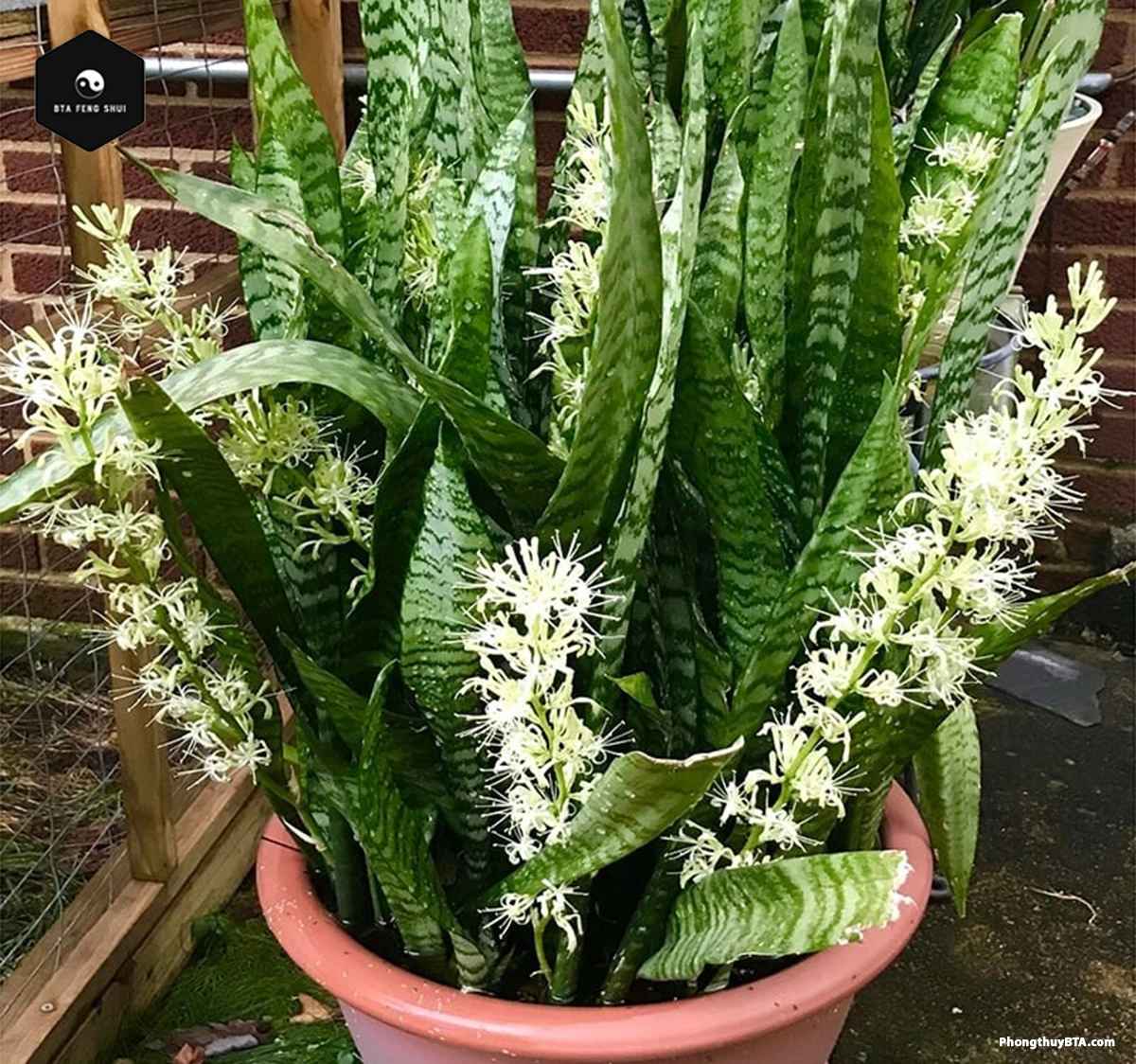 Cây Lưỡi Hổ có thể ra hoa khi được chăm sóc tốt, dù khá hiếm. Hoa nhỏ, màu trắng xanh, mọc thành cụm từ gốc và tỏa hương nhẹ. Theo phong thủy, hoa Lưỡi Hổ báo hiệu may mắn và tài lộc dồi dào.
