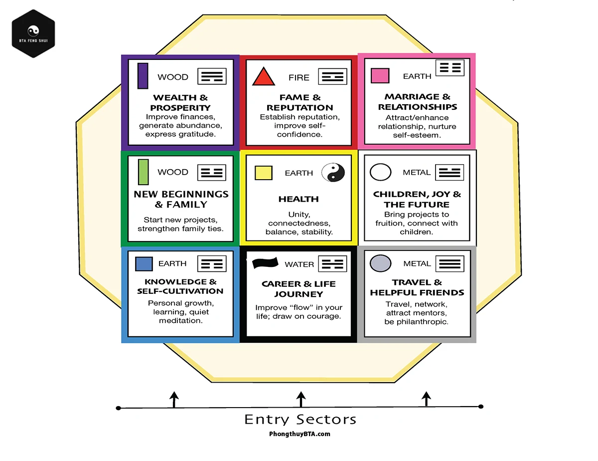 Each gua in the feng shui bagua map governs a specific life area. Here’s a detailed breakdown of each, including directions, elements, colors, and enhancement tips.